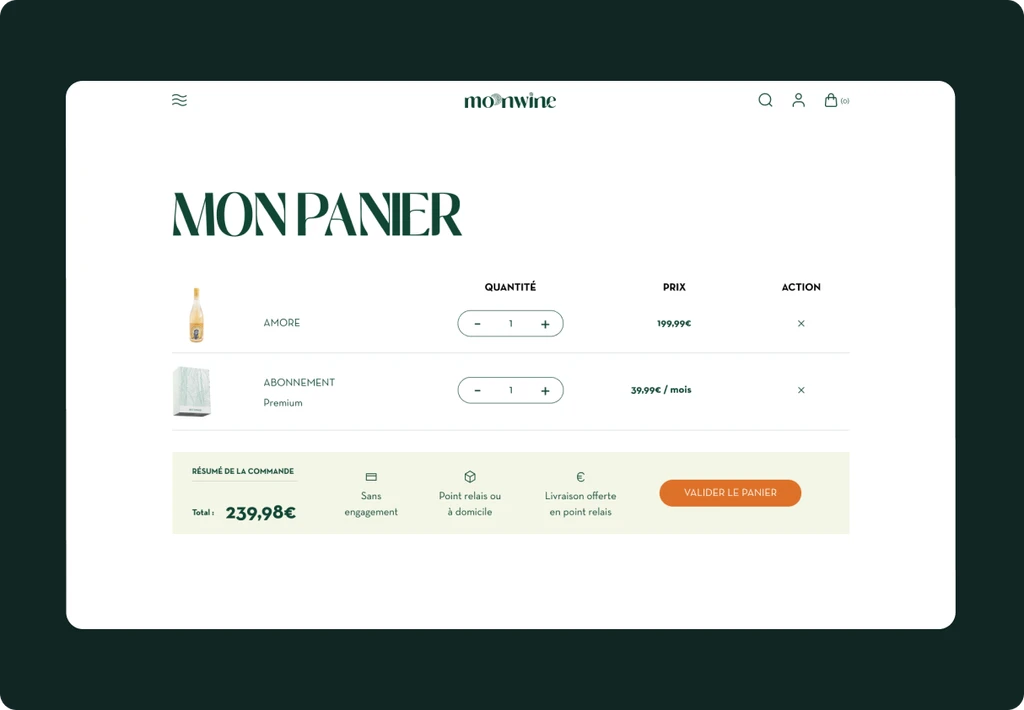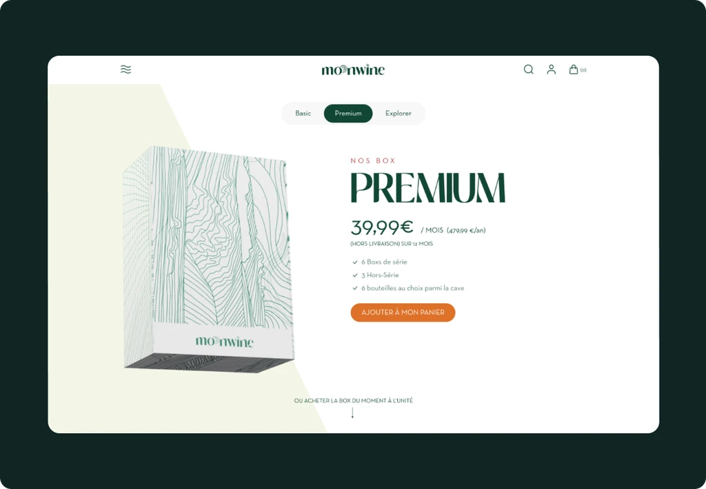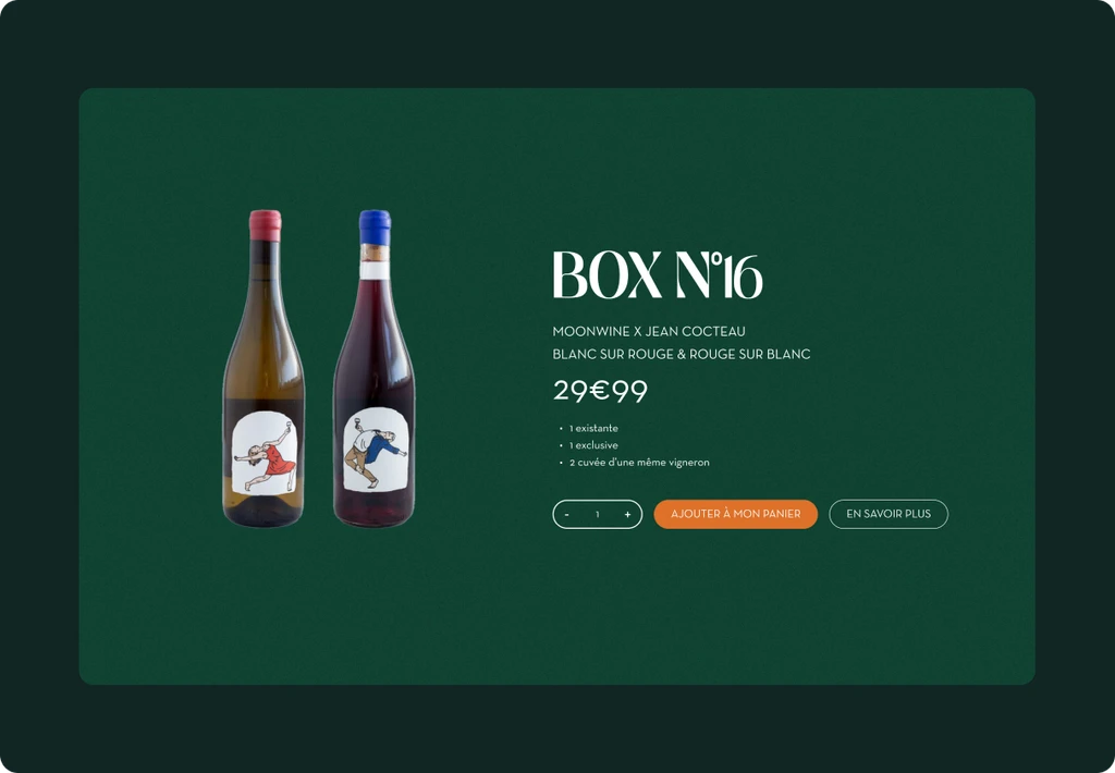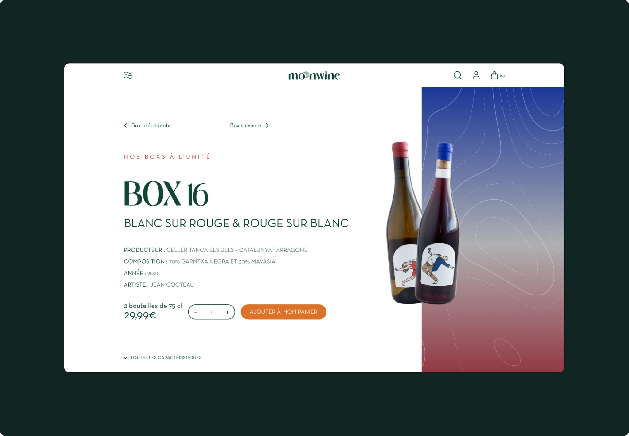 Moonwine est une entreprise qui propose des box de vins. Il s'agissait d’opérer une refonte de l’ancien site web aussi bien au niveau esthétique (en s’adaptant à une nouvelle charte graphique) qu'au niveau du parcours utilisateur.